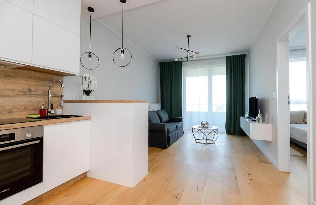 Along with coffee and tea making equipment, self-catering facilities in a full kitchen include a fridge, an oven, and glassware. Warszawa Sluzewiec train station is located just a short walk down to the apartment.